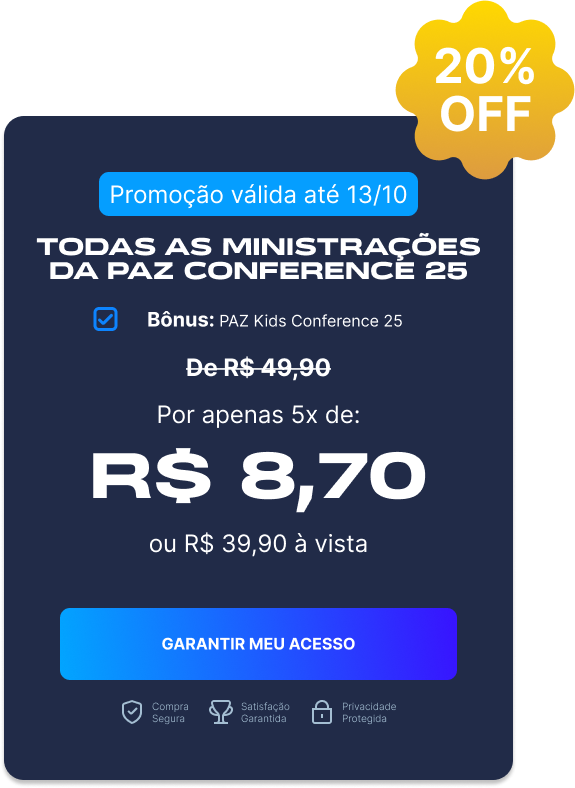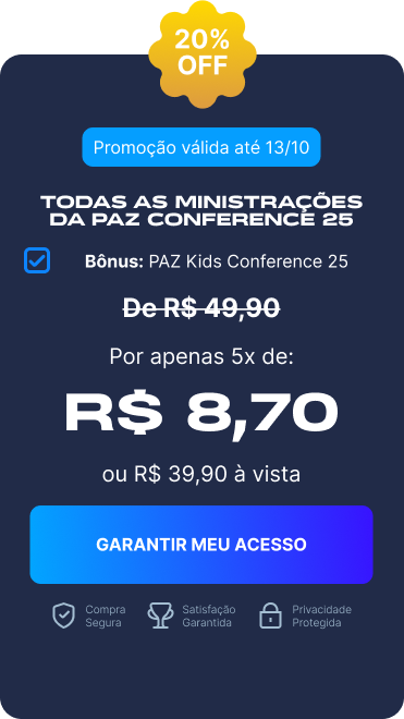 Ao adquirir seu acesso, você poderá assistir a todas as ministrações e painéis da PAZ Conference 25, além de receber como bônus a PAZ Kids Conference 25 – um verdadeiro treinamento para quem serve no ministério infantil e deseja investir na próxima geração.
