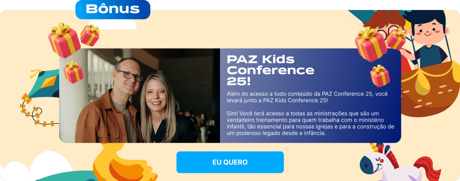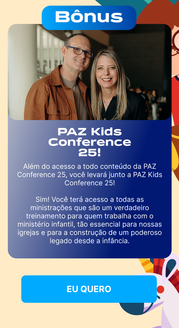 Ao adquirir seu acesso, você poderá assistir a todas as ministrações e painéis da PAZ Conference 25, além de receber como bônus a PAZ Kids Conference 24 e 25 – um verdadeiro treinamento para quem serve no ministério infantil e deseja investir na próxima geração.